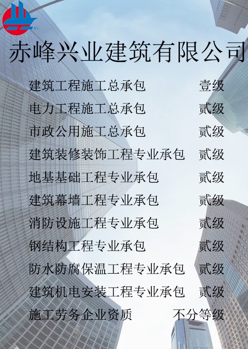 赤峰興業建筑有限公司簡介 赤峰興業建筑有限公司成立于1998年7月,位于內蒙古赤峰市松山區。現已發展成為擁有建筑工程施工總承包壹級、電力工程施工總承包貳級、市政公用工程施工總承包貳級、承裝、修、試四級、?建筑裝修裝飾工程專業承包貳級、建筑幕墻工程專業承包貳級、消防設施工程專業承包貳級、地基基礎工程專業承包貳級、鋼結構工程專業承包貳級、建筑機電工程專業承包二級、防水防腐保溫工程專業承包貳級以及建筑施工勞務等資質的綜合性建筑施工企...